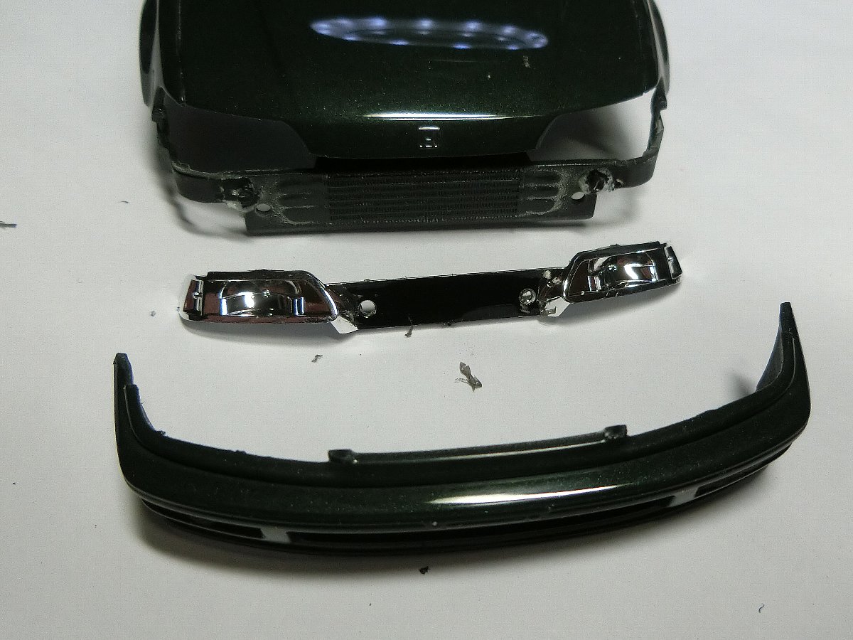 ヘッドライトのリフレクターはバンパー接着してしまうと嵌められない為塗装の際、Gクリアーで仮付けして研磨後に剥がしてリフレクター付けます。