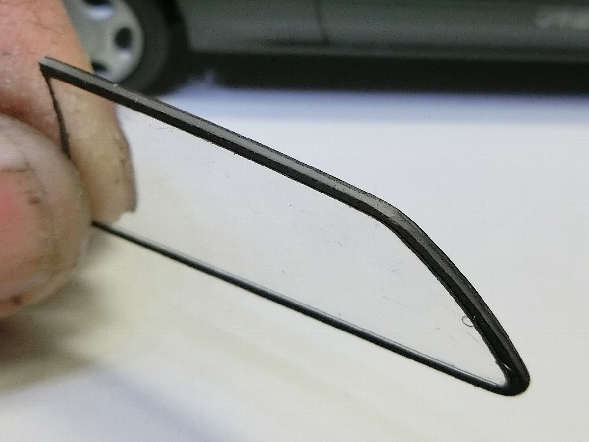 ガラス関連はフロント側は左右ドアガラスと一体なので私的お約束デカい状態にする為、表と裏から開口部に沿ってカッターでなぞって切り離し。