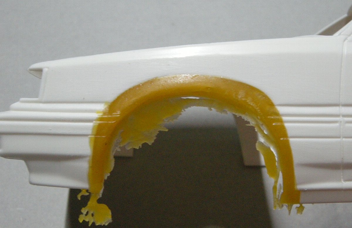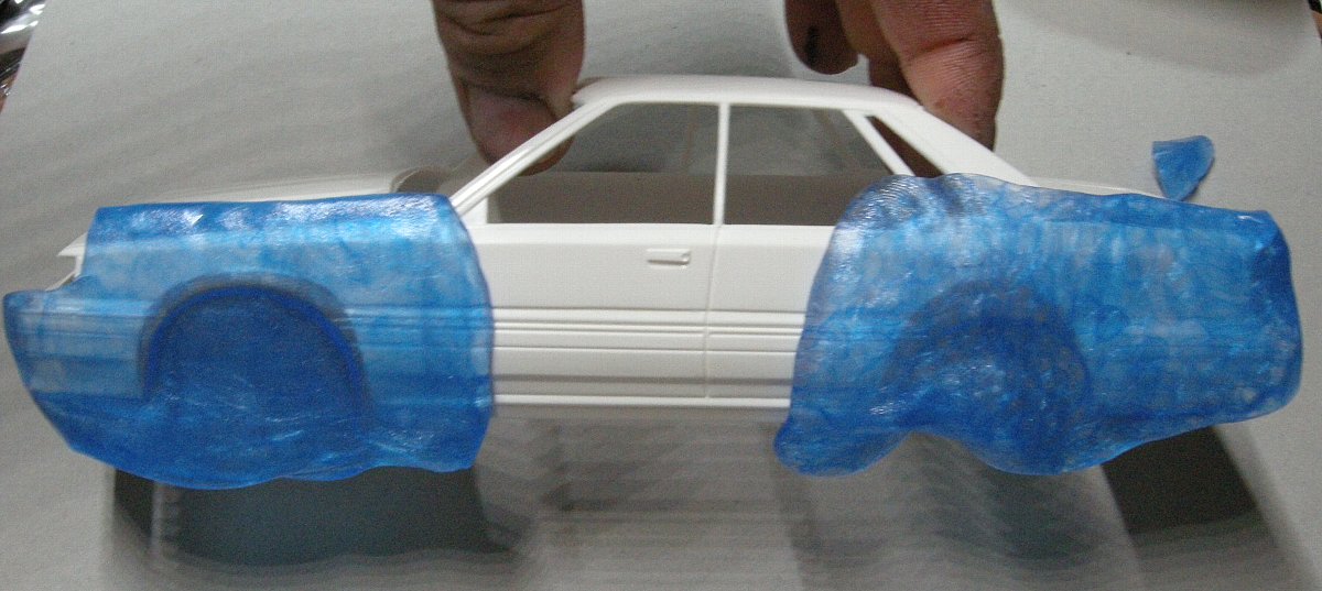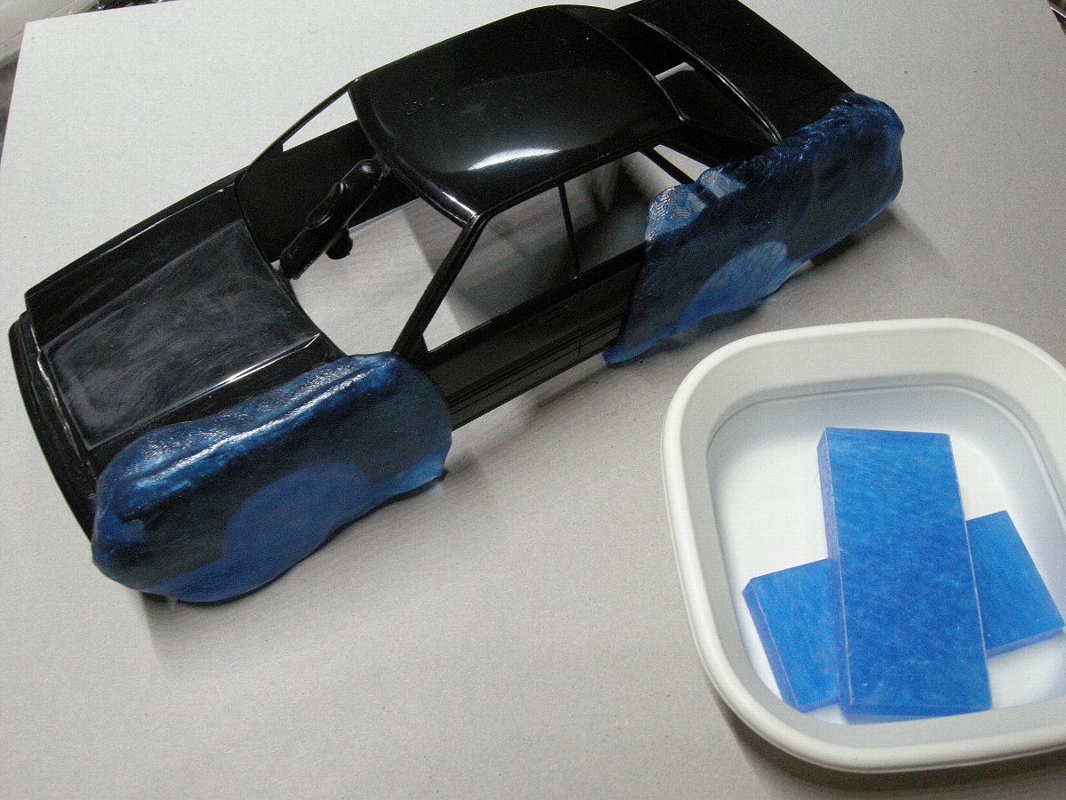 最近良く見かけるお湯で軟らかくなるプラスチック粘土、『型想い』とか『おゆまる』とかありますが今回はブンカ社の『かたとりまる』を用いまして、後期ボディのフェンダーに押し付けてフェンダーの型を取ります。