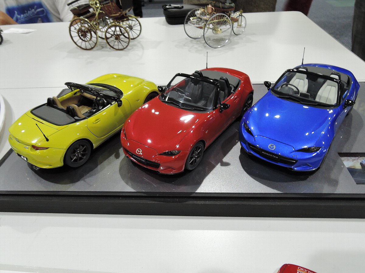 昨年原型状態でした最新マツダロードスター、三色そろい踏みでの出展、実車では赤以外に国内モデルに設定がないのが残念なビビッドなブルーとイエローの色彩鮮やかな色合い、実際に調色するとなかなかこうも綺麗な色がでないだけに色彩のセンスの素晴らしさの凄さにただただ恐れ入るばかり・・・