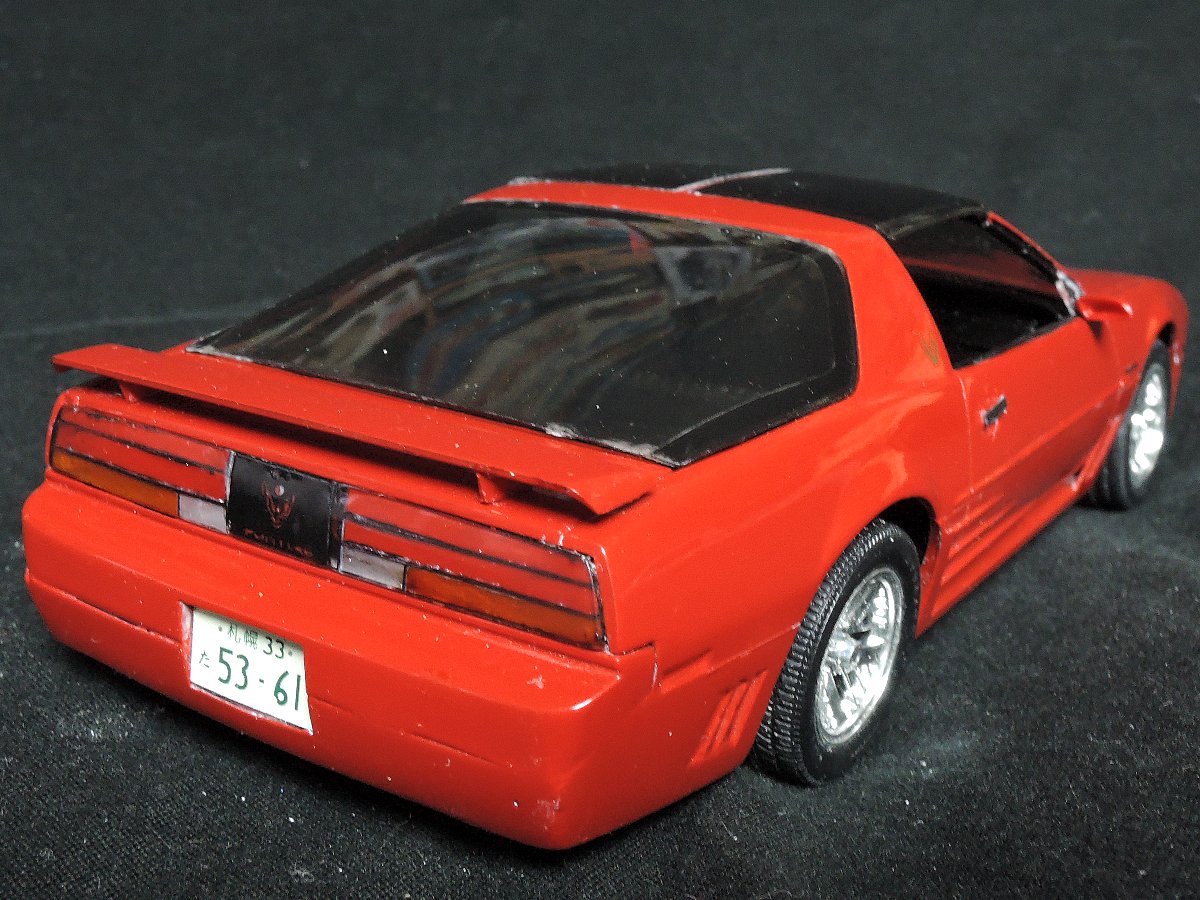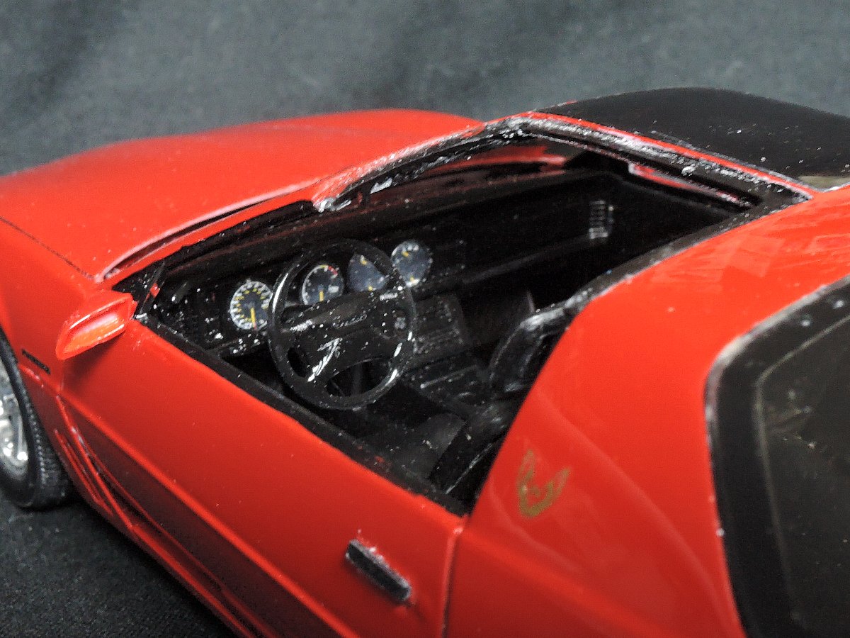 はい、91年公開のこの映画に登場する車両を再現すべく標準ルーフからTバールーフ化、エアロパーツ製作、ボンネット改修(キットのターボボンネットからトランザムGTA用ダクトボンネットを改修、ベースモデル用のプレーンな形状に変更)とまあこんな感じです。