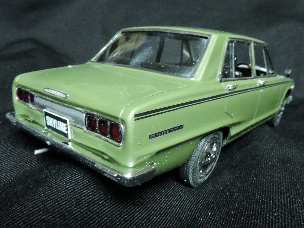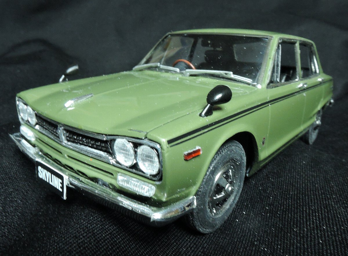 毎年年末恒例となりつつあるスカイライン特集、私が4気筒のショートバージョンを作るのももはや毎年恒例となっておりますが、2回目のマイナーチェンジ時の70~71年のスポーティデラックス、それもスポーツパッケージオプションとなるSSパック仕様として、タミヤのハードトップGT-Rをベースにアオシマのセダンのルーフセクション移植という毎度のごとくいじくり倒しております。