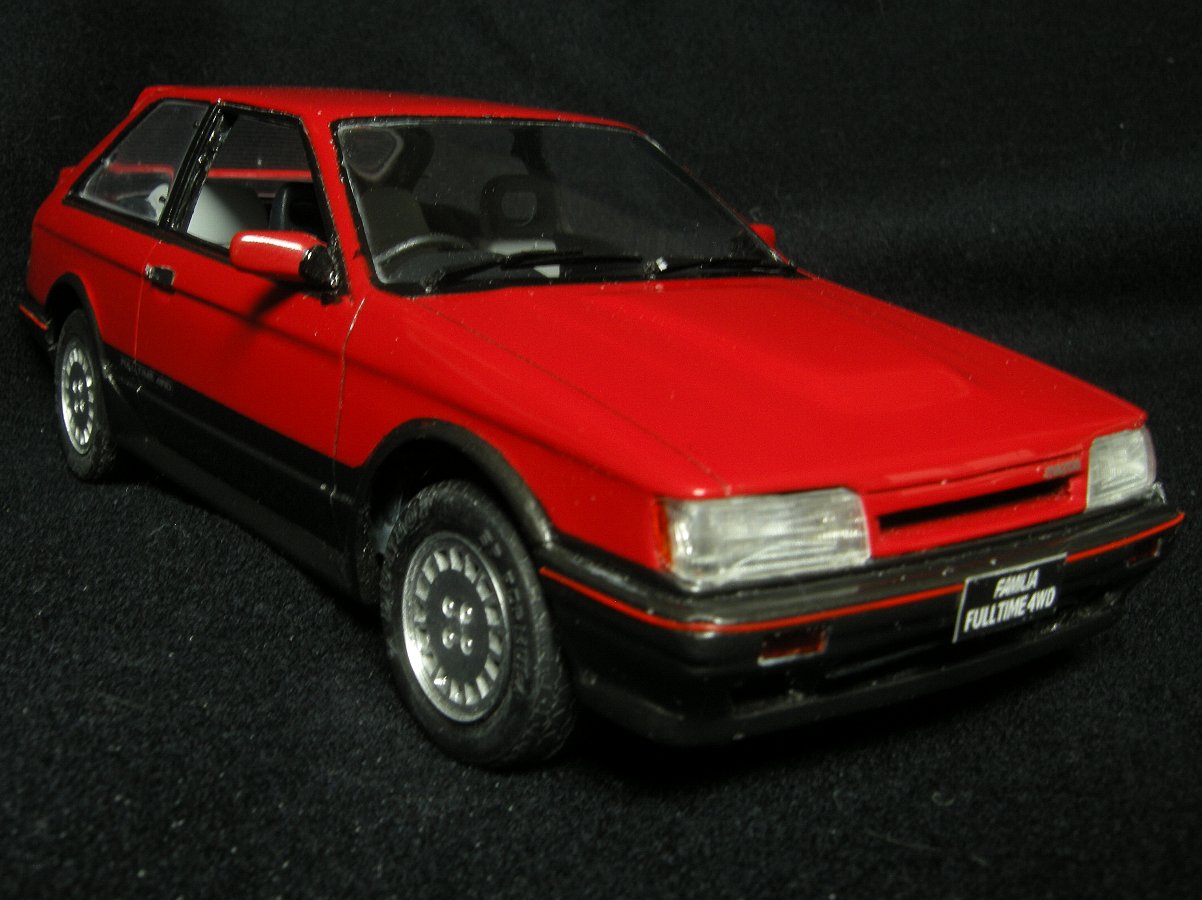 はい、例によって車種換えスクラッチでマツダファミリアGT-X,国産初のフルタイム4WD、と言う事でこちらをフューチャー、そしてモデルカーズでコンテストの常連で車種換えスクラッチの先駆者的存在の方々の中のおふた方で私も密かにファンでした広島県のK兄弟(ネット上と言うことでこちらでもアルファベット表記とさせてくださいませ)の弟氏がかつて製作された作品に同じ条件でフジミのAE86レビンをベースに挑戦してみた次第。