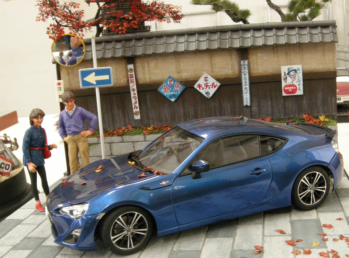 トヨタ86をモチーフに京都を舞台にした情景を再現されており、車体は言うに及ばずフィギュアや土台に背景、そして枯葉に到る小道具まで抜かりのない再現度に心惹かれました。