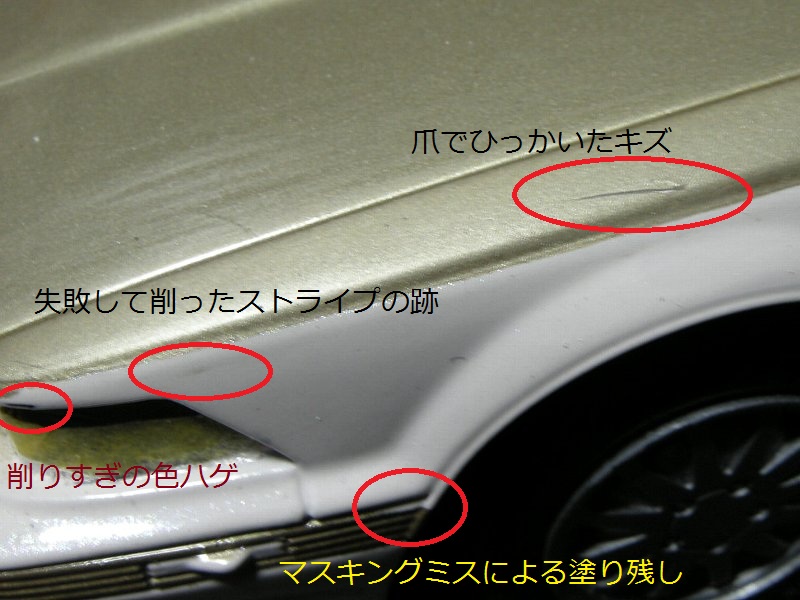 塗り残し部分は画像だけでなくよりによってフロントバンパーのモール部分、ウインカーの筋彫り位置を見誤ってしまいその脇部分の目立つところを忘れてしまうと言う・・・