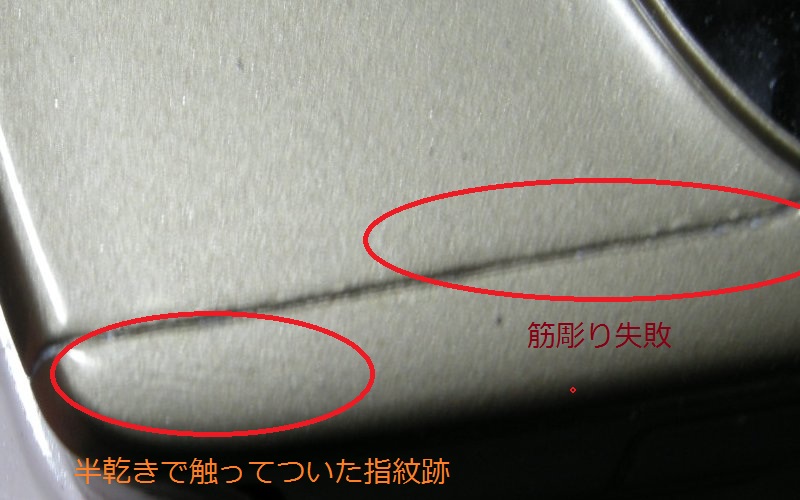 とまあ、こんなザマでして、後ろ側の指紋跡、画像だと見づらいですがこれでも表面を磨いた後のもので、メタリックの粒子の並びが指紋の跡の部分、くっきりでこぼこに見える状態、でも表面はまっ平らという残念な状況。
