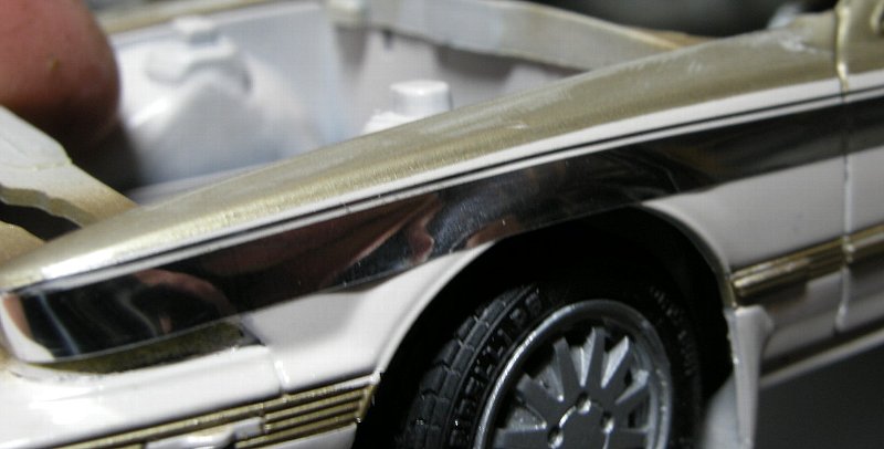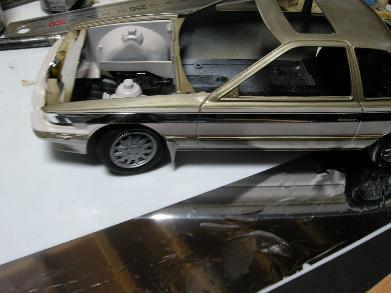 こういうときに限って作るベースの色(今回は8番のシルバー)の在庫が少なく、かといって買いに行ってる時間が無かったのであるだけの量で作ったものの、抱いていたイメージが実際の色調から離れてて、やや緑がかった色になってしまい、しかも希釈割合を間違えて濃度を薄くしすぎたものだからメタリック粒子が流れまくってまだらになり、やむなく中断し今度は濃い目に吹いてツートーンの境目のストライプを表現するべく細切りしたマスキングテープ、張るときも相当難儀しただけでなくはがす段階でも途中でちぎれるわ、マスキングした境目から塗料が入り込みラインがガタガタ、更に追い討ちかけるがごとくテープについた塗料がまるで焼きたてのピザのチーズのごとく糸引いて更に酷くなる始末・・・