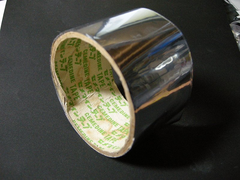 この商品には2種類の材質のものがあってアルミ素材のものと、ビニール系の素材にメッキ処理されたもの、で今回使ったのは後者のほうでテープのコシがあって粘着力があり、なおかつ引っ張り耐性がある程度ある(引っ張っても容易に伸びない)素材ということを考えて探して見つけたモノ。