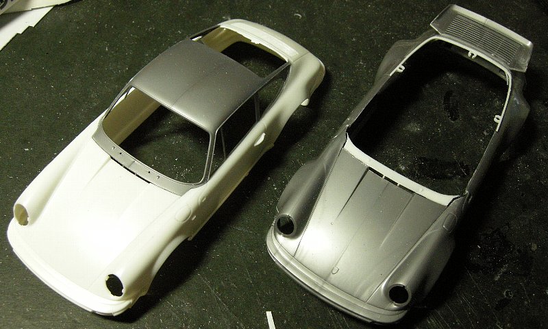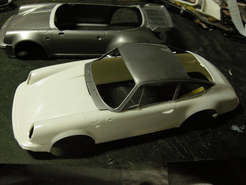 こちらで同じくスピードスターをベースにクーペに改造されました作品がありまして、なおかつ、というかそもそものきっかけはスピードスター、キット指定の標準ボディ仕様のほかにターボ用ワイドフェンダー仕様の『ターボ・ルック』というワイドボディの選択も可能で、なおかつ前生産台数の9割以上がこのターボルックだったとのことで、せっかく作るんならこのターボルックのほうが派手でいいかな~なんて思ったのが始まりで、さらにフツーの911クーペも作りたいと思っていてもフジミの911カレラ(ボディ3種とも)持ってますけれど、エンスーシリーズだけに作るとなるとそれなりに気合入れないと作る気になれまへん。