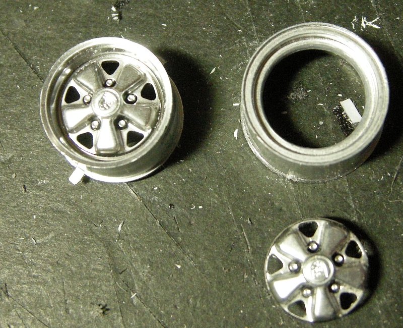 それに伴って、ホイールの外形を15インチから16インチにするためにディスク部分を切り出して16インチでなおかつディスク部分のはまる形状のホイール(今回は西部警察のガゼールオープン用)のディスク部分を刳り貫いたものに組み合わせます。