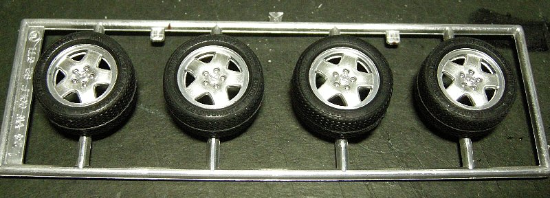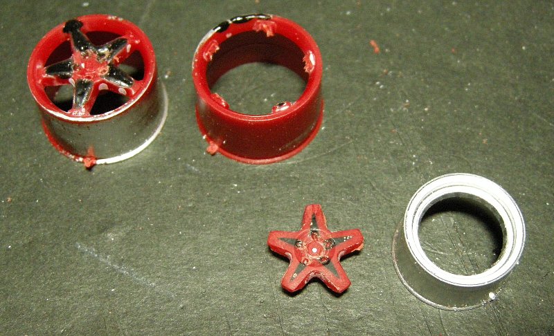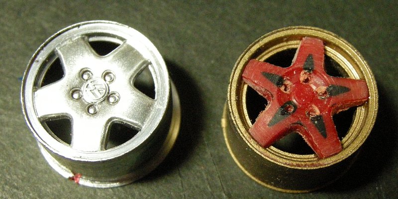 で、どうやったのかと言うと余りモノのホイールから形状の似ているフジミフェラーリF355用のスポーク部分を加工してリューターで削りだし、15インチサイズのホイールのセンターを刳り貫きリム(画像は別のもので実際に使ったのはタミヤのR30スカイラインブラックスペシャル用のもの)だけにしたものと組み合わせました。