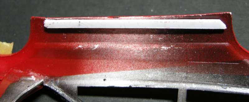 そしてそのツメがバンパーの段差部分の下のほうに来る形になるように接着したのですがそれだけでは左右にずれてしまう上に上下にも・・・つまりきちんと固定できるわけが無くそこからプラ板でL時形状にきった物をきり書いた部分がボディのツメに入る形にして接着しています。