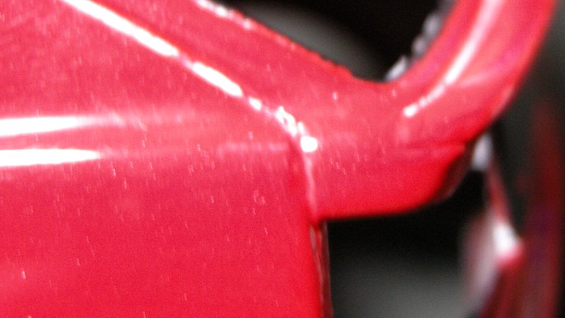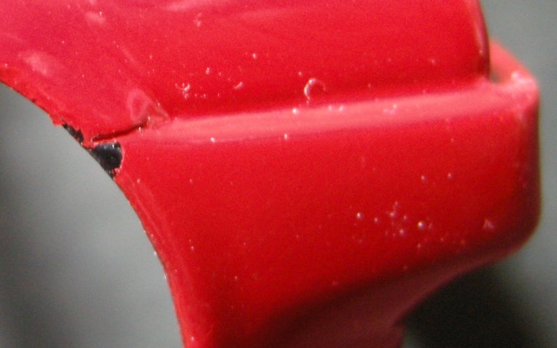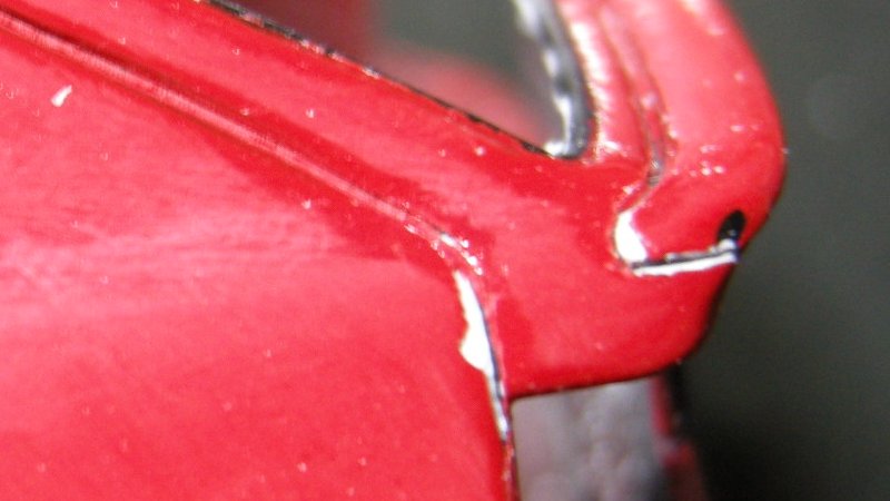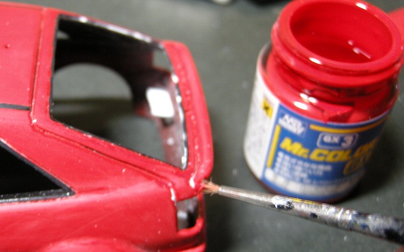 そのため、これらの部分を修正するわけなんですが、通常ですとボディにペーパーをかけてハゲた部分の回りも含めて広い範囲で色を削り取るのがまあセオリーなのは判るんですが、そうなると今度はその部分だけ塗ろうものならほかのところと色が合わなくなるためその周りも含めて・・・下手したらもう1度全部ひっくるめて塗りなおしなんてことになりかねず、そうなると今度はやたらと塗装が厚ぼったくなってしまう上に厚くなった分だけほかもはがれやすくなったりひび割れ起こしたりなんて事のもなりかねない。