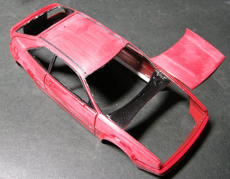 こちらはこちらでテールゲートの端とリアスポのオープニングラインの筋彫りが埋まってしまい、(筋彫り甘かったのか亜h玉たはがしきれなかった色が残っていたのかさて・・・)ここの修正を試みようとカッターで切込みを入れて支持彫り彫ったら見事にはげるという・・・それも下地の色までひっくるめて!!