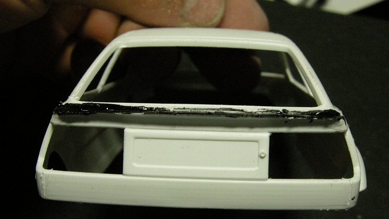 そこで問題が無ければ双方の形状を整えつつ、チリあわせをするのですがこのクルマの場合スポイラーがボディに覆いかぶさるためスポイラー後ろ端のすそを伸ばしランナーで延長しボディに被る部分を追加します。
