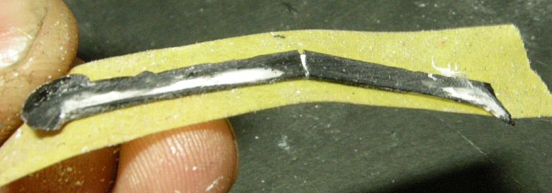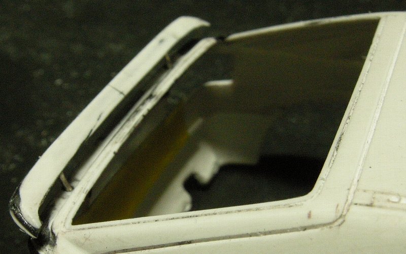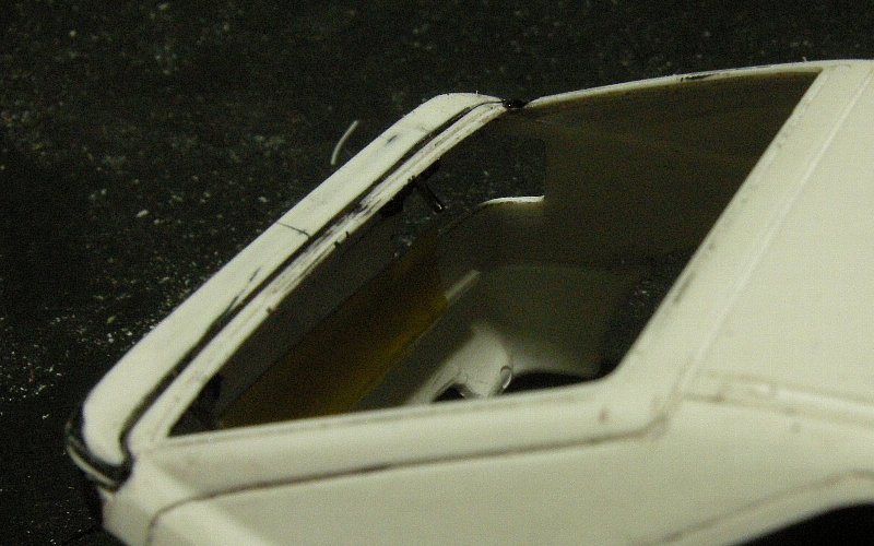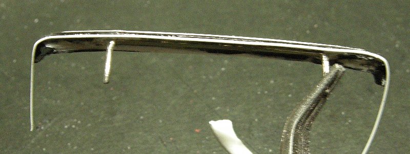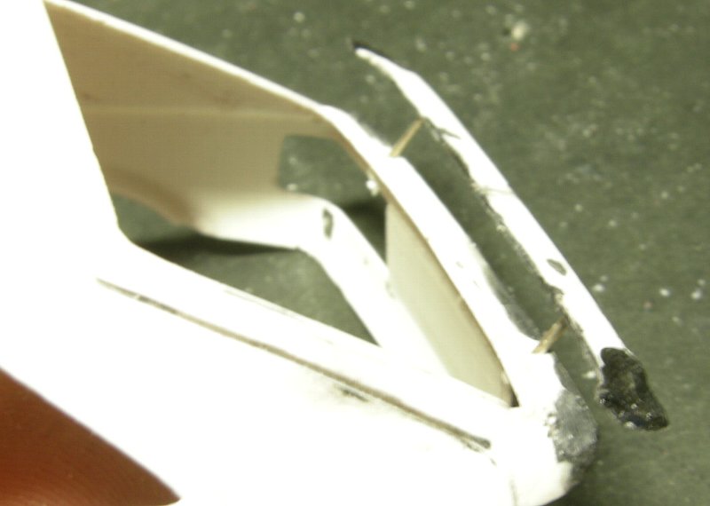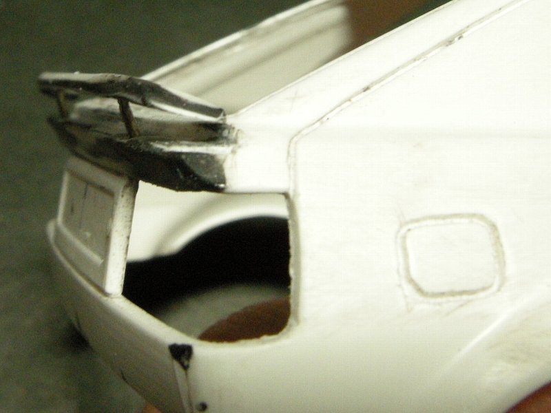 この際、スポイラーの接着面の部分をリューターで掘り込んでおき(画像では見えませんが、この段階で彫ってあります)金属線が埋没するように接着、はみ出した部分をヤスリで削っております。