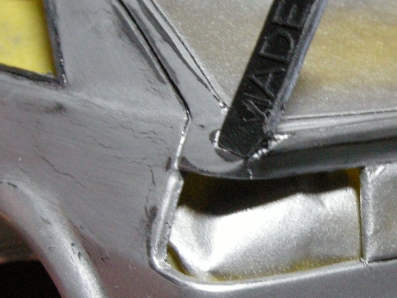 このときボディとスポイラーがくっついてしまわないように位置を仮に合わせ、瞬間接着剤をごく少量だけ点付けし、硬化したのを見計らってスポイラーを取り外してがっちりと瞬間接着剤を塗りつけて余分を削りながら形状を整えます。